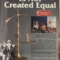 Giant gold balance scale. The left pan occupied by a group of workers (bakers, technicians, teachers, etc.) who contribute to production all smiling and the right has a single brown bag labeled “rice bran".”