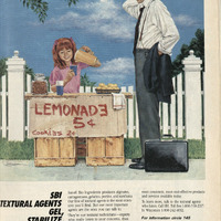 Painted illustration of a young girl running a small lemonade stand made of wooden crates, with a hand-painted sign reading “LEMONADE 5¢” and “cookies 2¢.” She is smiling while pouring lemonade into a blue cup. A middle-aged man in business attire stands in front of the stand, holding his jacket and scratching the back of his head (unsure or amused). A briefcase is on the ground beside him. They are in a seemingly suburban neighborhood with white picket fences, green grass, and a blue sky with clouds.