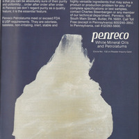 Penreco Petroleums meet or exceed FDA & USP requirements. They are odorless, tasteless, non-irritating, inert, stable, and highly versatile ingredients that may solve a product or production problem for you. For complete specifications or test samples, contact Charles Steenbergen or any member of our technical department. Penreco, 106 South Main Street, Butler, PA 16001. Call Toll Free (except in Pennsylvania) 800/245-3952. In Pennsylvania, call 412/283-5600.