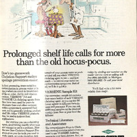 This advertisment is for a chelation product. Chelation is something that I do not know much about. After looking it up I found out that chelation uses chelating agents that bind to metal ions that prevents these metals like iron or copper from catalyzing chemical reactions that spoil food or cause discoleration thus helping food have a longer shelf life. This advertisment highlights that this product has been used for years emphasizing their longevity. I also found it interesting that this product mentions the manual to use Versene chelating agents. This is something that I have noticed in multiple advertisments that they are promoting a book or manual about a product.