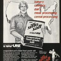 A drawn image of a man holding a Sifto Salt bag, with the words ‘EVAPURE FG evaporated food grade salt’. Behind him is a sketch of the United States. In the bottom right hand corner of the advertisement, there is another sketch of the same man holding a Sifto Salt bag and a pickaxe with the label ‘SIFTO Sam’.