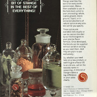Alt Text: This ad is for Stange Company spices, and the picture demonstrated serveral transparent glass jars and containers filled with different spices, powders, and liquids. All the containers are put on a table made by marbles. The background of the image is dark which made the containers and spices inside easily stood out. On the left side of the image, there’s a headline of “THERE’S A LITTLE BIT OF STANGE IN THE BEST OF EVERYTHING!”. Whereas on the right side, there is a block of texts accompanying to promote the company in terms of products and service and the address of the company.