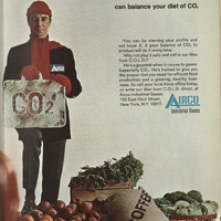 Alt Text: This is a printed advertisement fo Airco Industrial Gases which demonstrated a man wearing winter cloth, including a red hat scarf, and gloves, standing at the center of fruits and vegetables. Holding a giant ice block labeled “CO₂.” The backgroud is plain and white and the headline at the top “AIRCO’S MAN FROM C.O.L.D.” By the right side, there is accopanying text explaining the product and service offered.
