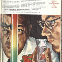 Observation: The advertisement used a illustration rather than a photo. There are 2 men working in the lab trying to onserve the color of liquid in glass containers. At the front it can be seen the tube with colorful liquid, with the background of fruits such as strawberry and lab equipments. At the top of the page, there are texts and the headline. At the right, there are texts explaining the taste of food and its color. Overall, the advertisement linked an experimental scenario with food related elements.