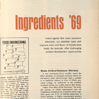 Alt Text:A magazine page labeled as “Ingredients ’69”, using big red text, with many textual analysis for food additives and ingredient technology. On the left there is a picture of “Food Engineering” magazine. On the right, there’s the complimentary text how to hide the taste of artificial sweetener and mainwhile improving food color and flavor.