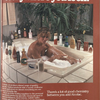 This advertisment has a red background and is advertising the brand Alcoloc at the top of the page in large white letters. Under the white writing there is picture of a naked women with dark blond hair washing her legs in a bubble bath and this edge of the bath tub is covered with different self care products including shapoo, bath oil, and toothpaste.