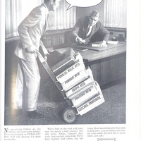 The majority of the page in this advertisment is taken up by an image of two men in an office. One man is pushing a dolly that is holding boxes labeled with the names of different types of food acids including: Pomalus Malic Acid, Fumaric Acid, and Adipic Acid. The other man is looking at the stack of boxes with a confused expression. The man with the pushing the dolly has a speech bubble saying “Did you think we make only one food acid?” Under this image this is some small black text on a white background exlplaining the many different types of food acids that the company (Allied Chemcial) makes.