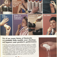 The top half of the advertisment has eight boxes each with a different image to represent different applications of American Colloid Company’s product (Bentonite). Some of the example applications include: a young boy brushing his teeth, a women putting on sunscreen, someone polishing a shoe, a women smelling a purfume, and man about to swallow a pill. Under these images is black text on a white background discussing the benefits of Bentonite as well as an image of Bentonite in a more natural form as a white powder.