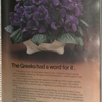 The advertisment has background that fades from brown to orange as it moves down the page. The top half of the advertisment features an image of a bouquet of violets while the bottom half features black text, discussing the history of the violet fragrance as well as the future of the fragrance thanks to Union Camp.