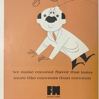 This advertisment has a brownish Orange background. In the middle of the page their is cartoon scientist on his hands and knees and cartoon coconut is bouncing off of his head. Under this image is text claiming that the company (Food Materials Corporation) can make a coconut flavor that taste more like coconut than a real coconut.