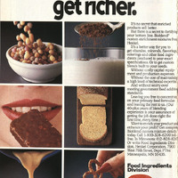 Six close-up images of nearly perfect-looking foods enriched with the advertised product, including cereal, coffee, bread, mac and cheese, pretzels and other snacks, and a close up mouth eating a bar.