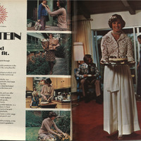 A women wearing traditional mid-20th-century house dress is shown performing various household tasks, including sending her child to school, carrying groceries, cooking, gardening, and holding a cake.