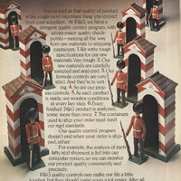 You’ve told us that quality of product is the single most important thing you expect from your suppliers. At P&G we have a stringent quality control program, with seven major quality checkpoints-running all the way from raw materials to shipping container. 1. We write tough specifications for our raw materials. Very tough. 2. Our raw materials are carefully sampled and analyzed. 3. Our formula controls are very strict. And they’re in writing. 4. So are our process controls. 5. As each product is made, we monitor conditions at every key step. 6. Every finished P&G product is analyzed, some more than once. 7. The containers used to ship your order must meet our rigid standards.