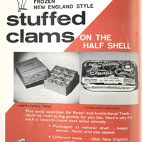 Below the main title is a real image of stuffed clams in a box with dividers alongside another image with the front of the packaging which states, ‘Matlaw’s New England Style Stuffed Clams Fully Prepared ON THE HALF SHELL’