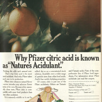 I find it interesting how it mentions “nature’s acidulant” in the title but then the only thing about nature mentioned is that it adds a natural zest. This ad markets Pfizer citric acid as a natural flavor enhancer that doesn't add any unwanted aftertastes. It emphasizes the product's versatility and easy solubility, positioning it as a reliable tool for a wide range of food and drink formulas. Georgia Salcau