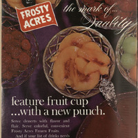 The mark of quality. Feature fruit cup… with a new punch. Serve desserts with flavor and flair. Serve colorful, convenient Frost Acres Frozen Fruits. And if your list of drinks needs some imagination, new Frosty Acres Fruit Punch is a winner. Try it!