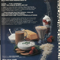 Blue background with many dairy-based foods and drinks depicted on the page as well as a description of their milk protein ingredients. A hand is pouring what seems to be white dots, representing the milk protein ingredients that New Zealand Milk Products, Inc. is advertising.
